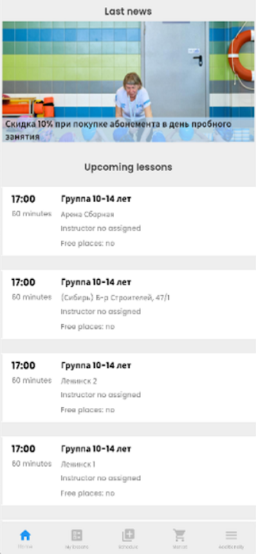Приложение для посетителей Академии детского плавания «Лягушонок». Мобильное приложение дает возможность следить за новостями, оперативно получать информацию об изменениях и спецпредложениях, отслеживать срок действия абонемента, остатка занятий, сроки действия справки, записываться на занятия в режиме on-line, совершать покупки абонементов, товаров и услуг