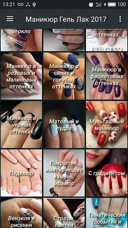 В приложении представлено множество идей для маникюра. Идеи отсортированы по тематикам согласно стилям и видам маникюра.