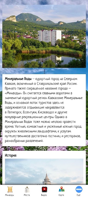 В приложении можно совершить первое знакомство с городом Минеральные воды, выбрать место для путешествия, посмотрев достопримечательности и видео обзоры. Также в приложении есть информация об экскурсионных бюро и отелях, предлагающих свои услуги в Минеральных Водах.