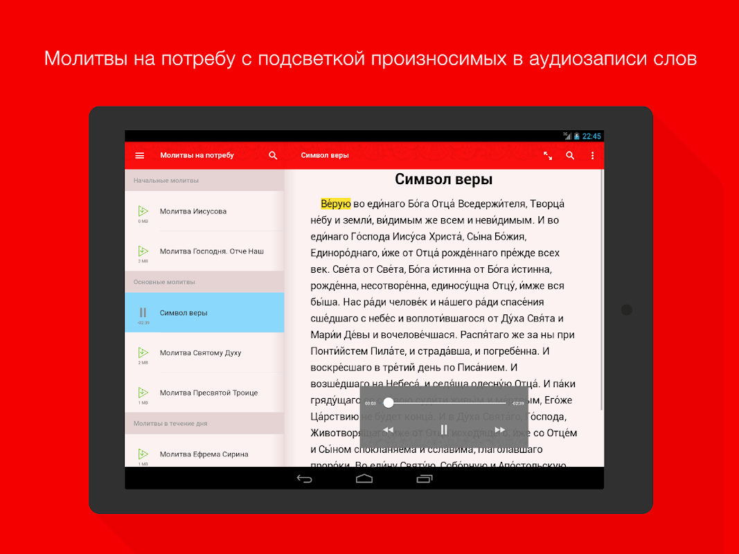 Возможность прослушивания молитв позволяет не отказывать себе в желании помолиться в ситуациях, когда чтение невозможно (за рулем, в болезни).