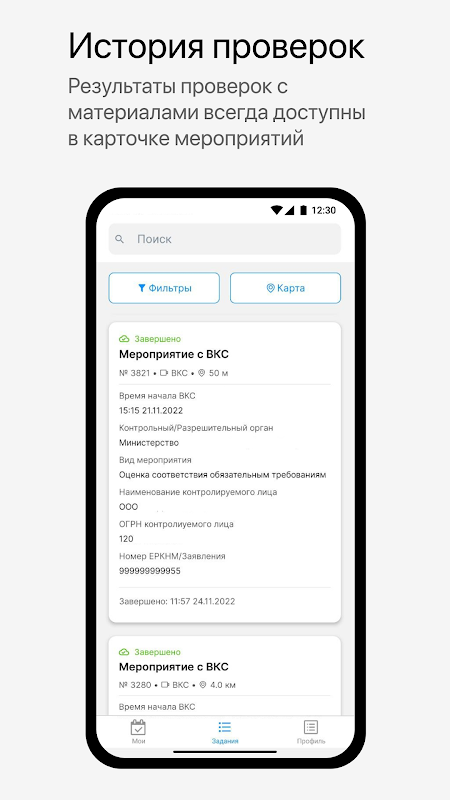 После проведения мероприятия с ВКС пользователь может посмотреть видеозапись проверки в приложении и отправить видеозапись на почту. Заполненные проверочные листы так же доступны в приложении и ими можно поделиться через почту и мессенджер.
