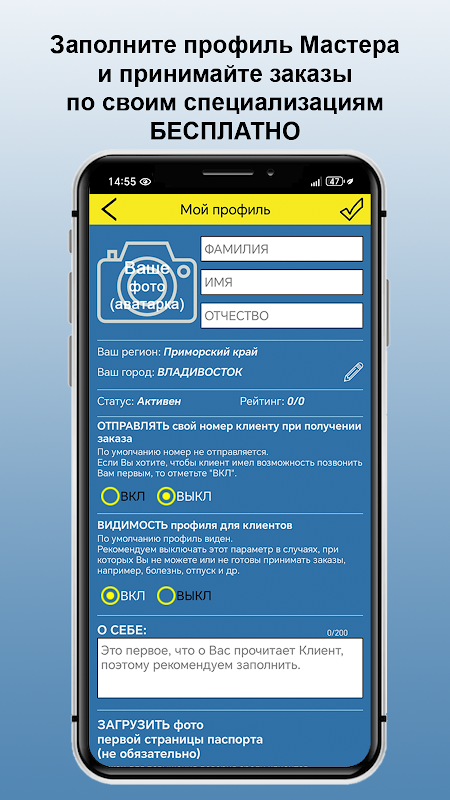 Мастер получает заказ и связывается с Клиентом. Клиент может сделать один заказ нескольким Мастерам и из них выбрать любого на свое усмотрение. Таким образом, Мастер должен находится в режиме ожидания, а не Клиент. При этом приложение не обязательно должно быть постоянно открытым, НО обязательно запускать приложение хотя бы 1 раз в 3 месяца, иначе Ваш профиль будет удален без уведомления как неиспользуемый. Нам важно поддерживать базу мастеров в актуальном состоянии.