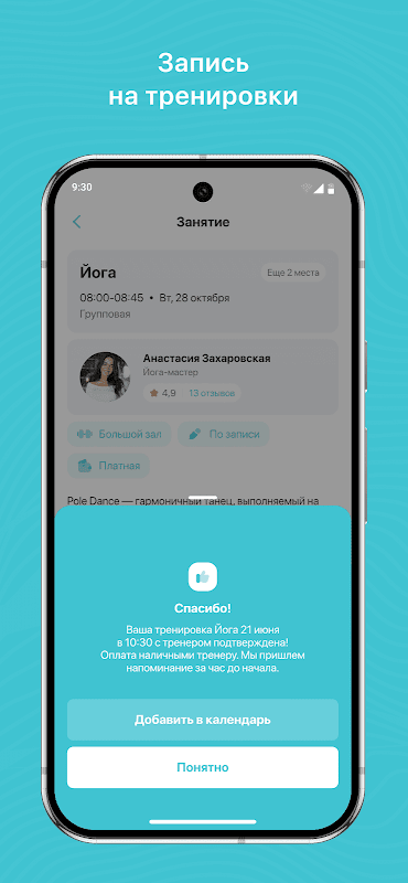 - Получать PUSH-уведомления о предстоящей тренировке за 3 часа;