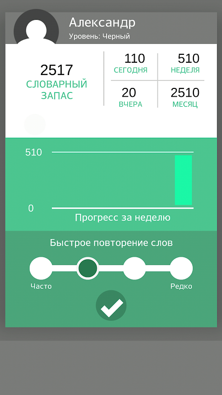 В "Настоящем полиглоте" есть детальная статистика, которая поможет вам лучше контролировать процесс обучения. В любой момент вы сможете посмотреть, сколько слов изучено в целом, за сегодня, вчера, неделю и месяц, а так же наглядный график прогресса за текущую неделю.