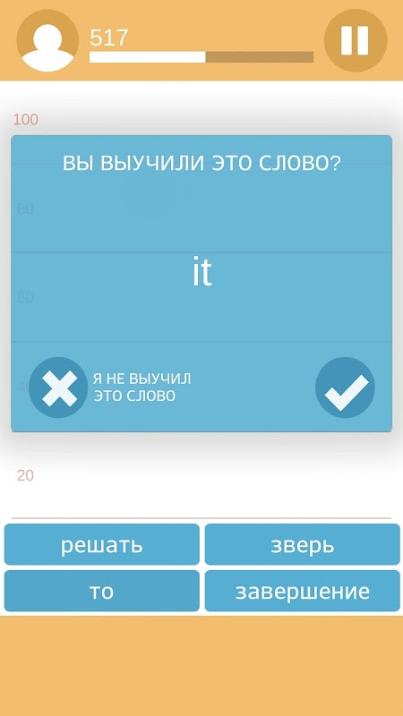 На этапе обучения, вы должны выбирать правильный перевод, для падающего из верхней части экрана слова. Каждое слово - имеет свой счет в баллах, правильный ответ - увеличивает количество балов, а неправильный - сжигает все набранные баллы. Чем выше находится слово в момент ответа, тем больше баллов засчитывается. Как только слово набирает 500 баллов, оно переходит в изученные.