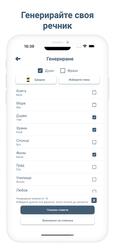 Бросьте себе вызов с помощью различных тестов, таких как сопоставление слов, перевод, аудирование и произношение. Эти тесты помогут вам отслеживать свой прогресс и закреплять свои знания.