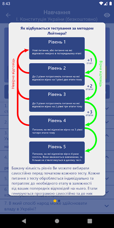 Эффективное изучение вопросов реализовано методом Лейтнера, который позволяет изучить и держать в памяти изученный материал неопределенное количество времени. Это достигается благодаря частому повторению пользователем вопросов, в ответ на которые он чаще ошибается.