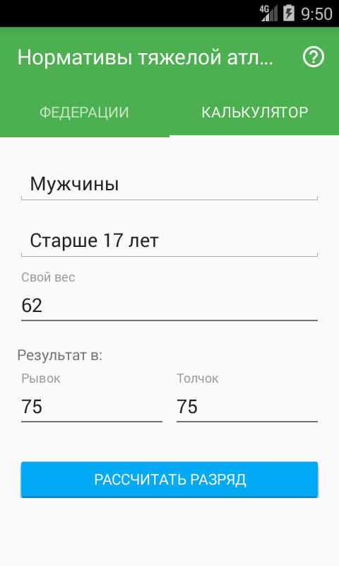 С помощью этого приложения можно узнать о своих достижениях в дисциплине Тяжелая атлетика. Посмотри текущие нормативы, введи свой пол, возраст и максимальные результаты в толчке и рывке - и узнай свой спортивный разряд.