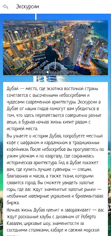 Бывает ситуация, когда Вы путешествуете один или парой, и вам хочется поехать на интересную экскурсию, но она стоит дорого, так как гид берет плату за группу. В этом приложении вы можете найти попутчиков для совместных экскурсий, и удешевить тур. В разделе приложения "Попутчики" опубликуйте свой пост и он будет виден другим пользователям приложения в радиусе 10 километров. А при нажатии на значок "геолокации" Вы и сами сможете увидеть другие такие предложения в радиусе 10 километров от Вас! Дополнительно в приложении можно совершить первичное знакомство с городами Дубай, Шарджа, Абу-Даби, выбрать место для путешествия, посмотрев достопримечательности и видео обзоры. Также в приложении есть информация об экскурсионных бюро, тур агентствах и отелях, предлагающих свои услуги в выбранном городе.