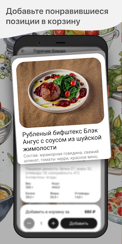 Выберите понравившиеся позиции из меню, добавьте их в корзину и перейдите на экран оформления заказа (по нажатию на иконку корзины).