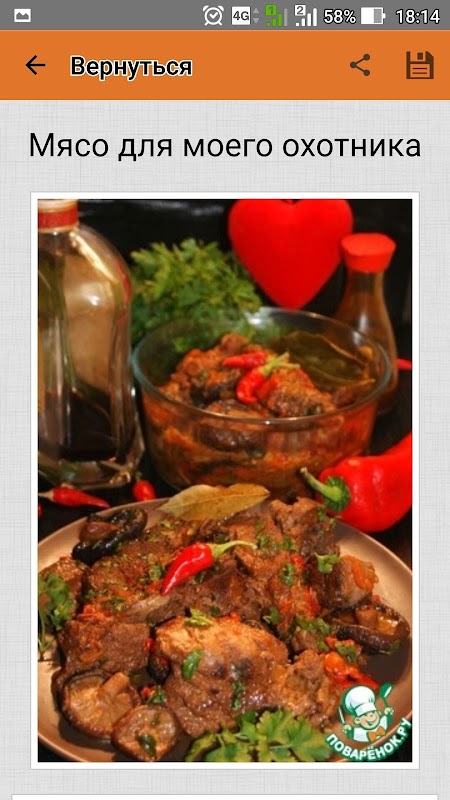 Охоту любят многие, вот только далеко не все знают о том, как приготовить аппетитного фазана или нежную оленину. С приложением Поварёнок.ру можно не беспокоиться об этом – здесь всегда найдутся лучшие рецепты самых популярных охотничьих блюд из лосятины, оленины, дикого кабана, фазана, рыбы и т. д. Откройте для себя целый мир вкуснейших и необычных блюд!