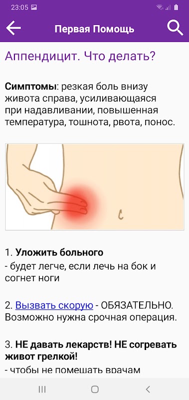 Данное приложение позволяет быстро найти нужную инструкцию по оказанию первой помощи благодаря алфавитному указателю. Например, если кто-то сломал руку, вы можете быстро открыть инструкцию по слову "Рука перелом" или "Сломал руку". Инструкции даны четко и ясно. Где необходимо - есть картинки.