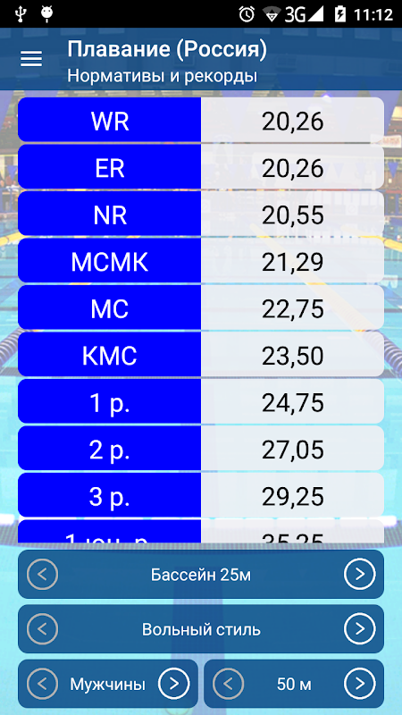 Если вы хотите знать с каким временем вам нужно плыть, чтобы получить спортивный разряд или спортивное звание по плаванию эта программа будет вам весьма кстати.