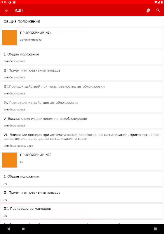 Кроме этого в приложении организована удобная навигация по основным инструкциям и распоряжениям в ДИ ОАО "РЖД".