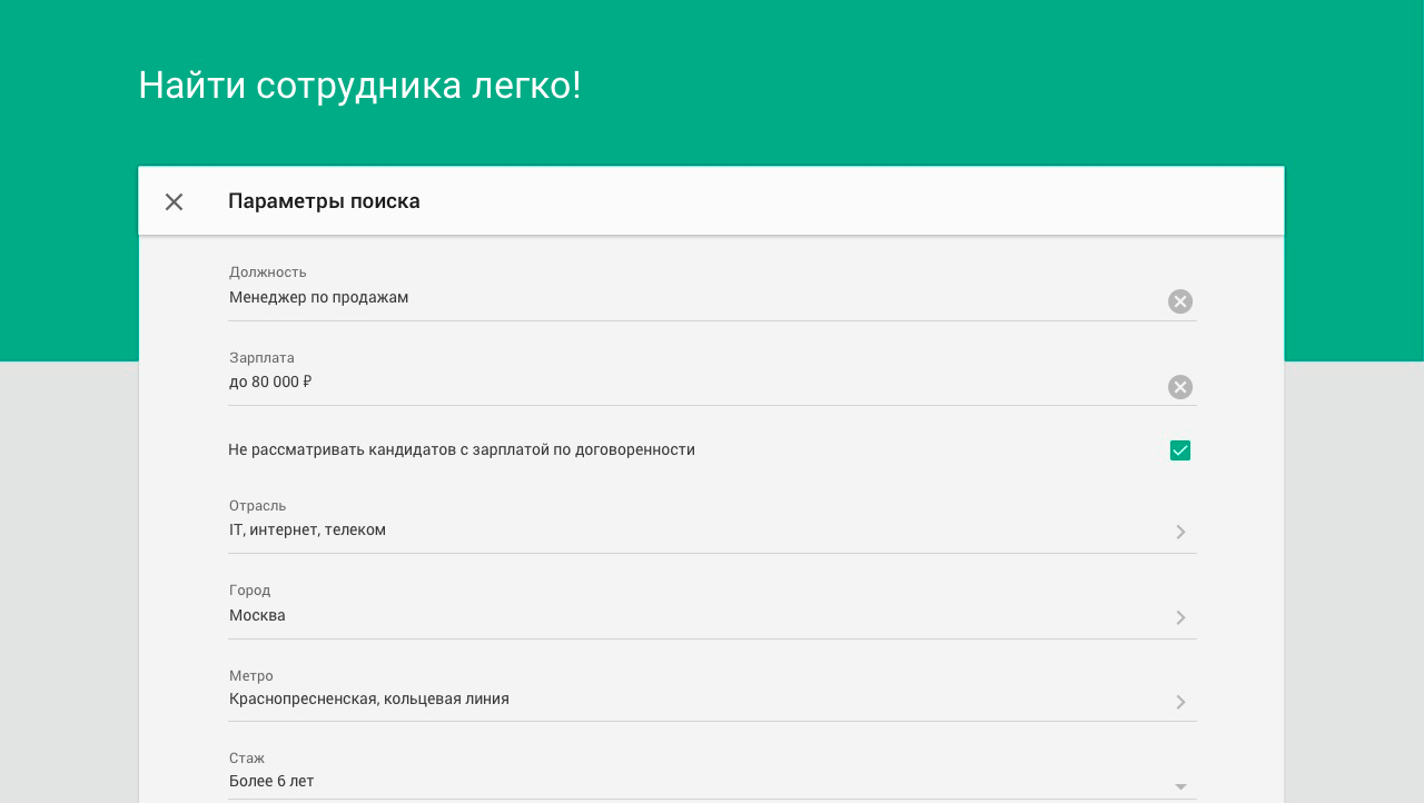 • Быстрый и удобный поиск: простые настройки и возможность получать подборки резюме с заданными вами параметрами помогут быстро выбрать лучших кандидатов на вакантные позиции вашей компании.