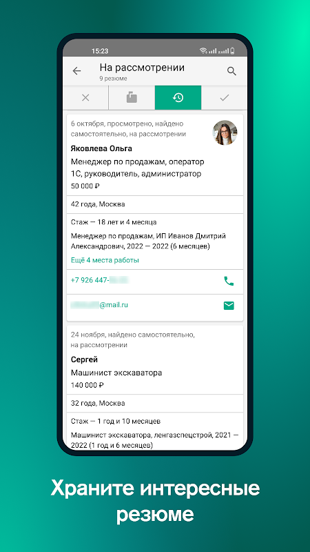 • Удобное хранение и мгновенная сортировка резюме: перемещайте их свайпами в сторону нужной папки.