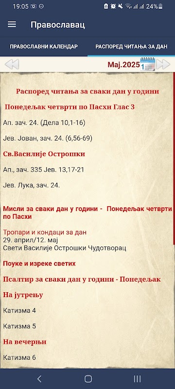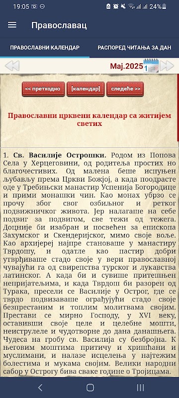 - В программе также присутствует православный церковный календарь с датами постов в течение года и житиями святых - Охридский пролог на каждый день года. В житиях святителей описаны жития и подвиги святых Православной Церкви.