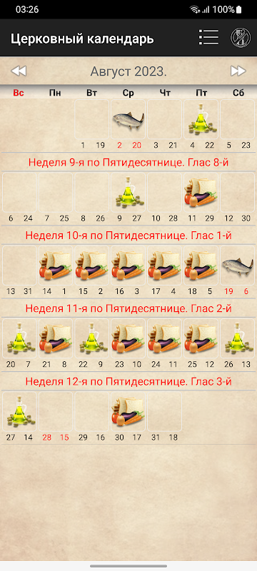 и типов поста. Календарь имеет три вида: текстовой, иконы святых и графический вид на период поста.