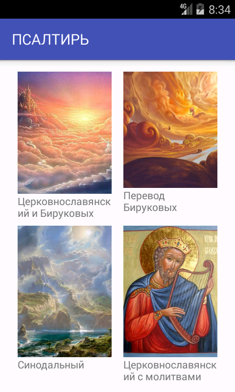 Псалмы царя Давида, предлагаются в четырёх вариантах чтения. Параллельное чтение церковнославянского перевода (русской орфографии) и близкого ему перевода Бируковых (способствует лёгкому обучению церковнославянскому языка). Отдельно перевода Бируковых. Синодального перевода. И церковнославянского (русской орфографии) с молитвами. Дополнительно молитвы предлагаются отдельной книгой. Ещё статья о Псалтири и переводе. А также Комментарии Т.А.Миллер на псалмы. Книга святоотеческих изъяснений.