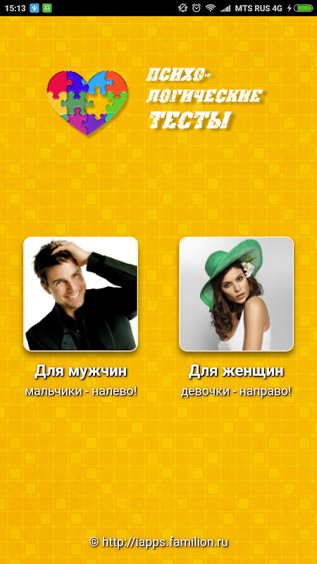Это приложение - сборник популярных и интересных психологических тестов. Имеются различные тесты как для мужчин (юношей), так и для женщин (девушек). Все тесты составлены профессиональными психологами, легки для понимания и не займут у Вас много времени, но позволят Вам узнать о себе или своем партнере много интересных вещей.