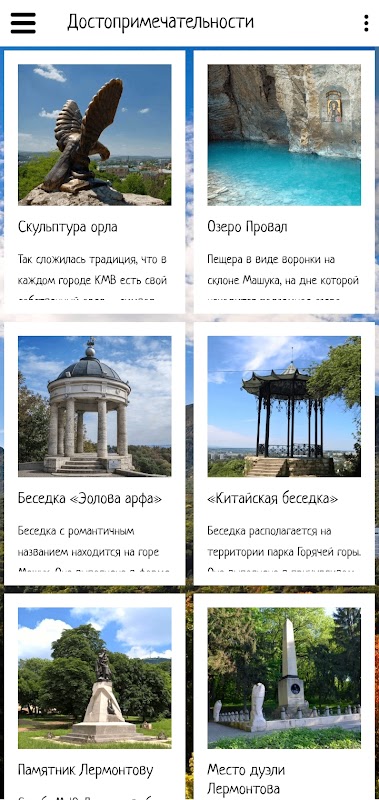 В этом приложении можно совершить первичное знакомство с Пятигорском, выбрать место для путешествия, посмотрев достопримечательности и видео обзоры. Также в приложении есть информация об экскурсионных бюро и отелях, предлагающих свои услуги в Пятигорске.