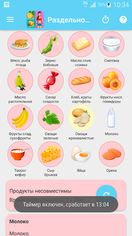 Так же у каждого продукта есть время переваривания, в приложение добавлен таймер, с помощью которого Вы сможете контролировать прием пищи.