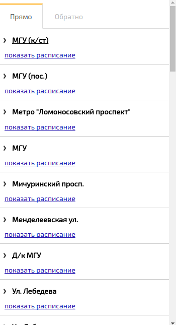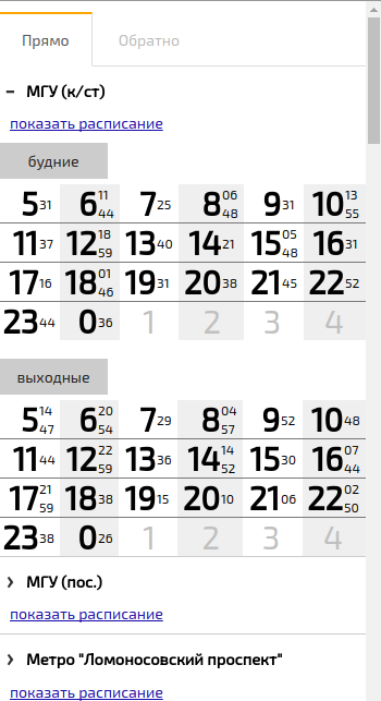 Чтобы узнать расписание достаточно выбрать направление и остановку.