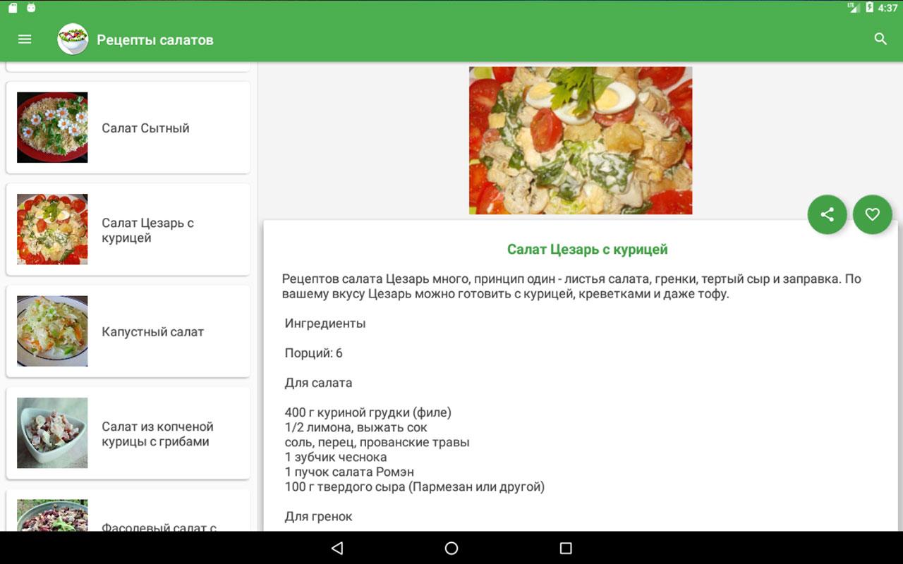 Приложение рецепты салатов оформлена в приятном дизайне и сопровождается каждый рецепт с фото салата. Понравившиеся рецепты Вы можете добавлять в избранное и также можете поделиться через приложение со своими друзьями.