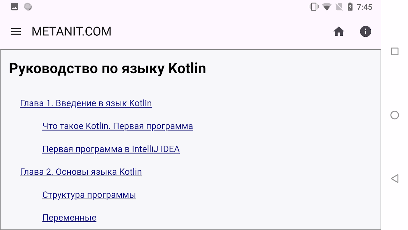 Руководство по языку программирования Kotlin, которое описывает все базовые концепции данного языка. Предназначено как для новичков, так и для тех, кто уже знаком с этим языком. Может использоваться в качестве справочника или самоучителя.