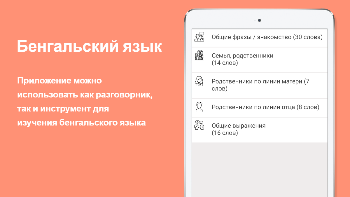 Русско-бенгальский разговорник можно использовать соответственно, как разговорник, так и инструмент для изучения бенгальского языка. Все бенгальские слова написаны русскими буквами и разбиты на 11 логических тем, то есть разговорник рассчитан на русскоговорящего пользователя (туриста).