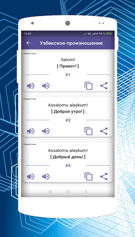 Узбекский разговорник. С этим приложением вы можете легко и просто изучать узбекский язык. Приложение работает в режиме ОФФЛАЙН и не требует интернет соединения для работы. Тут собраны самые необходимые слова и фразы для повседневной жизни. Если вы хотите изучать узбекский язык с помощью русского языка или же обратно то это приложение для вас. В этом приложение есть основные уроки узбекского языка, грамматика узбекского языка . Основные узбекские фразы с четким произношением и фразы русского языка с произношением. Также вы можете изучать слова и отдельно их отметить, пройти тесты чтобы укрепить словарный запас. Мы сделали всё, чтобы сделать освоение и изучение новых слов и фраз наиболее удобным!
