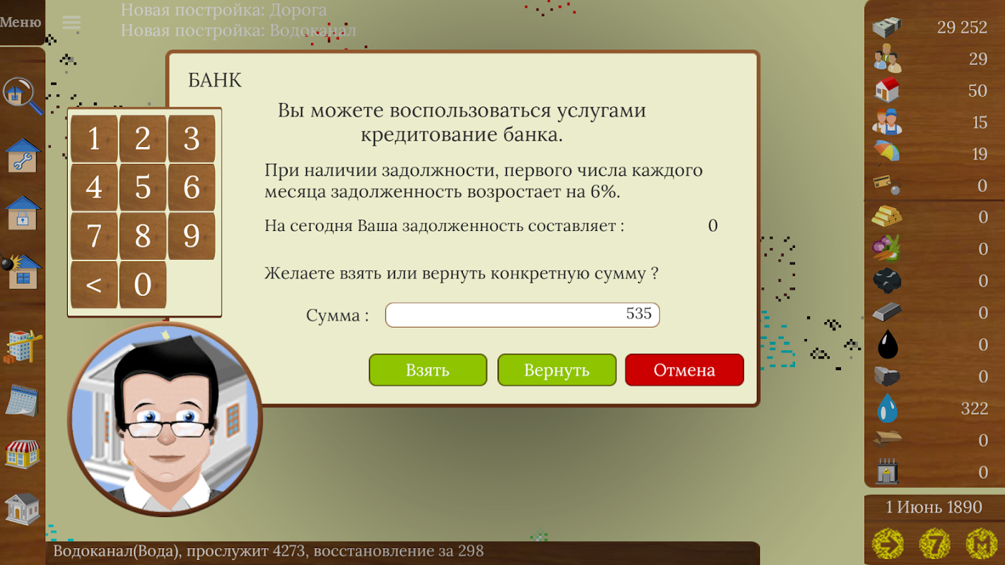 Вы можете создавать 33 вида строений.В некоторых клетках земли находятся определенные ресурсы (лес, вода, уголь и т.д.). Каждый день строения расходуют ресурсы и приносят прибыль. Некоторые строения могут работать только в определенные времена года.