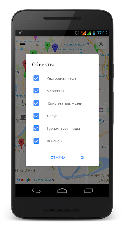 Основная функция приложения - это поиск информации о ближайших ресторанах и кафе, театрах и кинотеатрах, магазинах и центрах досуга на карте города.