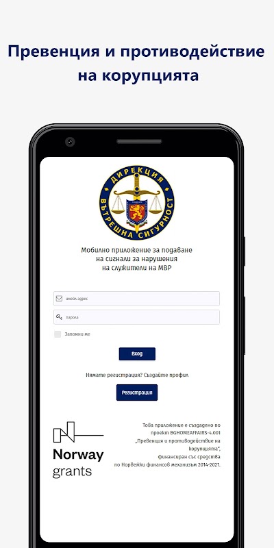 Данное мобильное приложение разработано в рамках проекта BGHOMEAFFAIRS-4.001.0001 «Предотвращение и противодействие коррупции», финансируемого за счет средств Норвежского финансового механизма на 2014-2021 годы в полном соответствии с положениями Приложения 3 Регламента реализации НФМ на 2014-2021 годы. , Руководство по дизайну и коммуникациям, опубликованное на https://www.eeagrants.bg/, коммуникационный план проекта.