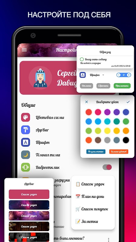 Вам случалось забывать о важных делах? Вы забывали важные моменты или семейные годовщины или даты платежей? Не волнуйтесь: используйте этот бесплатный, но эффективный диспетчер и отслеживатель задач. Он напомнит вам задачу или годовщину, поможет управлять временем и наслаждаться жизнью, а так же встроен удобный список покупок, с возможностью им поделиться в любых мессенджерах.