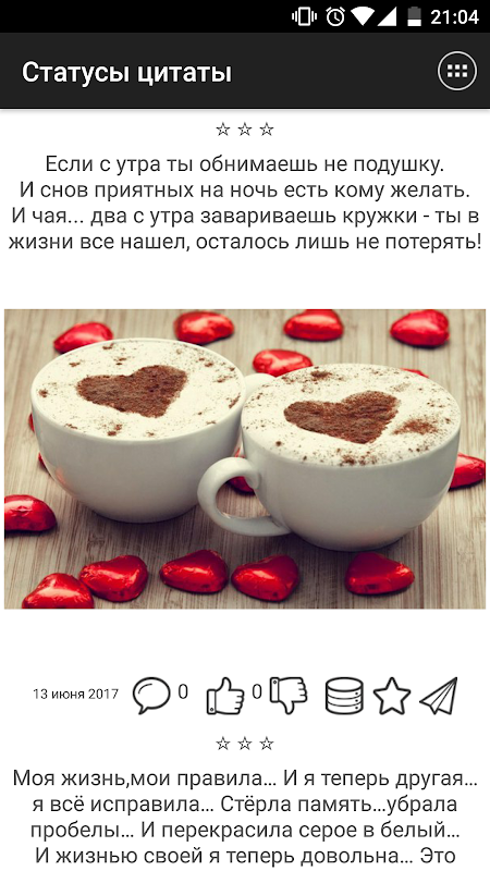 Понравившиеся записи можно комментировать и оценивать. Все понравившиеся картинки можно сохранять в галерее устройства в папке приложения. Ты можешь делиться записями с друзьями через социальные сети Facebook, Вконтакте, Одноклассники, Viber, WhatsApp а так же другие установленные на устройстве приложения. Ну и конечно, ты можешь оставлять лайки и сохранять записи в избранное.