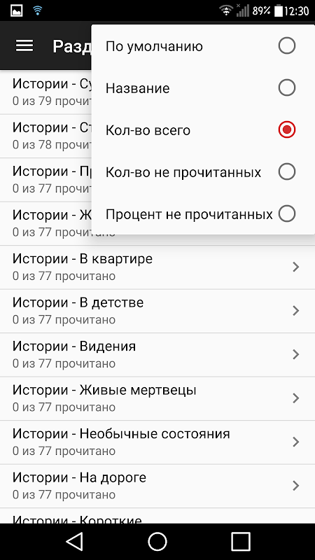Разделы страшных историй содержащиеся в приложении: