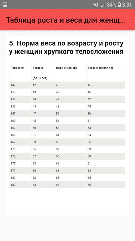• Таблица роста и веса женщин. Справочник скриншот 6