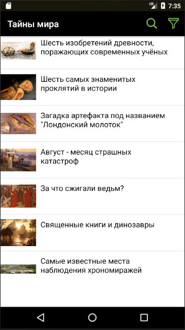 Лучшие материалы повествующие о загадочных и мистических событиях.Не раскрытые загадки истории человечества собраны в одном приложении.Узнайте всё об тайнах Сфинкса, чудовищном Василиске, древних космодромах Земли, пришельцах и многом другом. Самые мистические загадки мира.