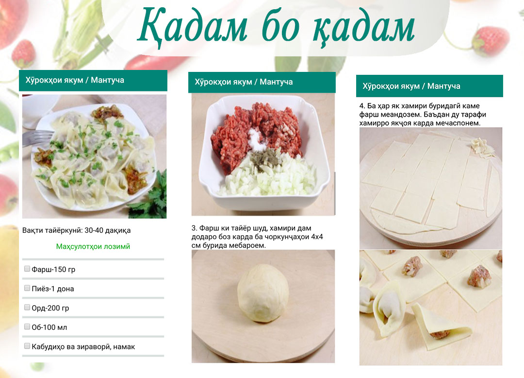 Таъомҳои болаззати тоҷикӣ аз қабили ош, манту, кабоб, мураббо ва ғ.