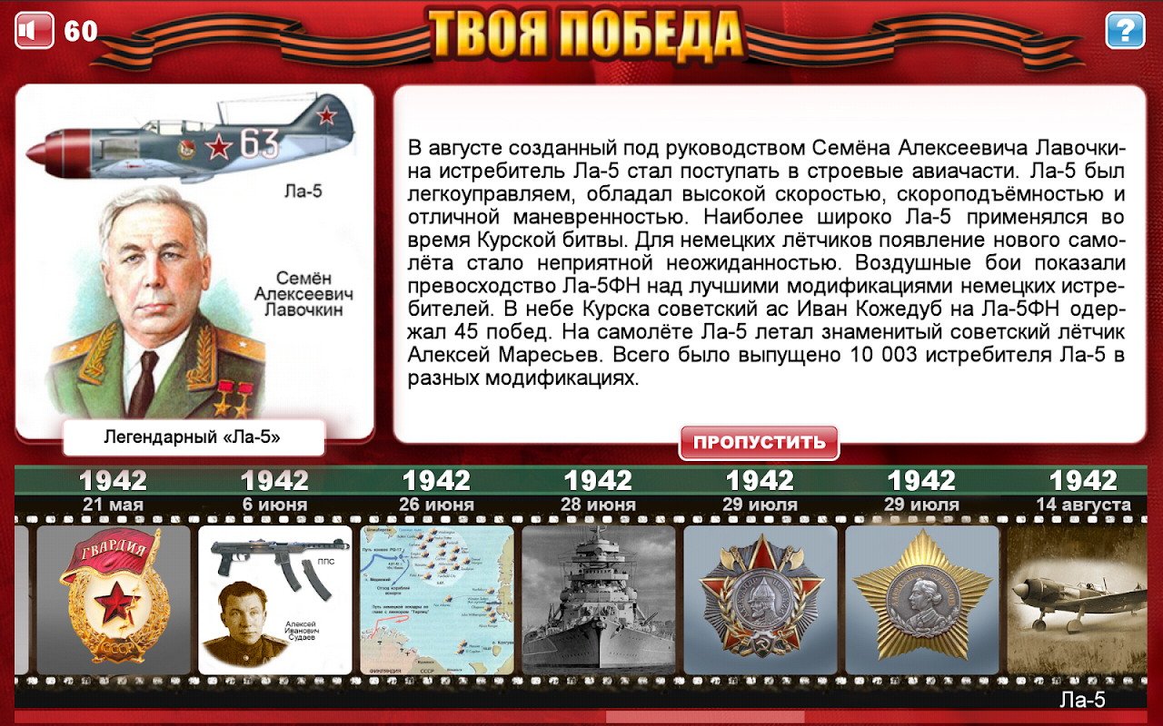 Эта страшная война, длившаяся почти 4 года (долгие 1418 дней и ночей), коснулась всех. Каждый день этой войны – история подвигов, тяжёлого труда, отчаяния или радости людей, очень похожих на нас, сегодняшних, твоих славных предков. Знаем ли мы о них? Помним ли их имена? «ТВОЯ ПОБЕДА» - возможность узнать или вспомнить ключевые моменты этой войны: сражения и спецоперации, триумфы политиков и полководцев, воинские подвиги и героический труд тыла. Ведь это благодаря им мы победили в самой страшной войне XX века! Давайте вспомним, как это было.