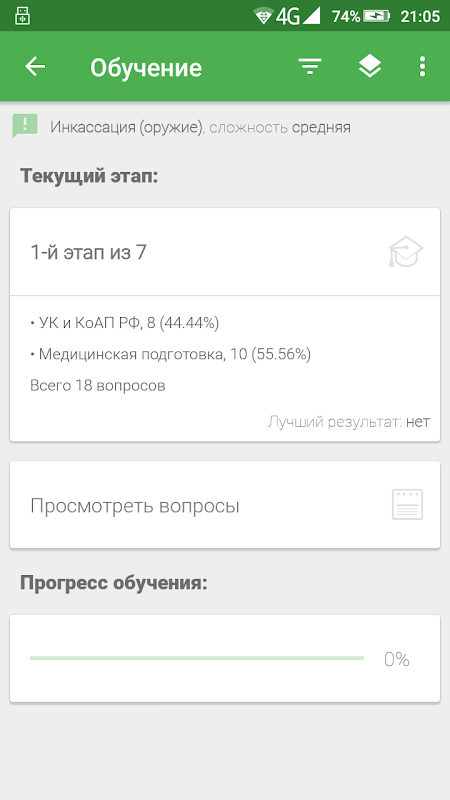 - режим "Обучение", который позволяет поэтапно изучить все вопросы выбранной категории