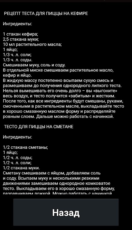 Пицца очень вкусное блюдо, которое можно приготовить в домашних условиях. Важнейшей составляющей любой пиццы является тесто. В нашем приложении, вы можете узнать самые популярные рецепты теста для пиццы. А именно: