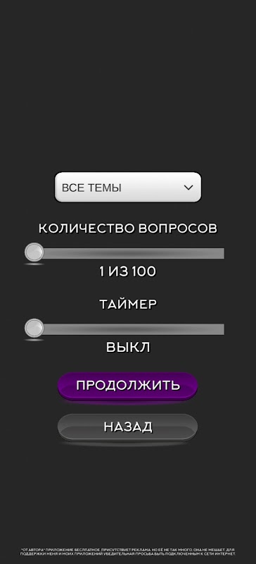 2) "Своя настройка". От 1 до 100 вопросов. Выбор темы. Регулировка таймера на каждый вопрос. Просмотр пояснения ответа.