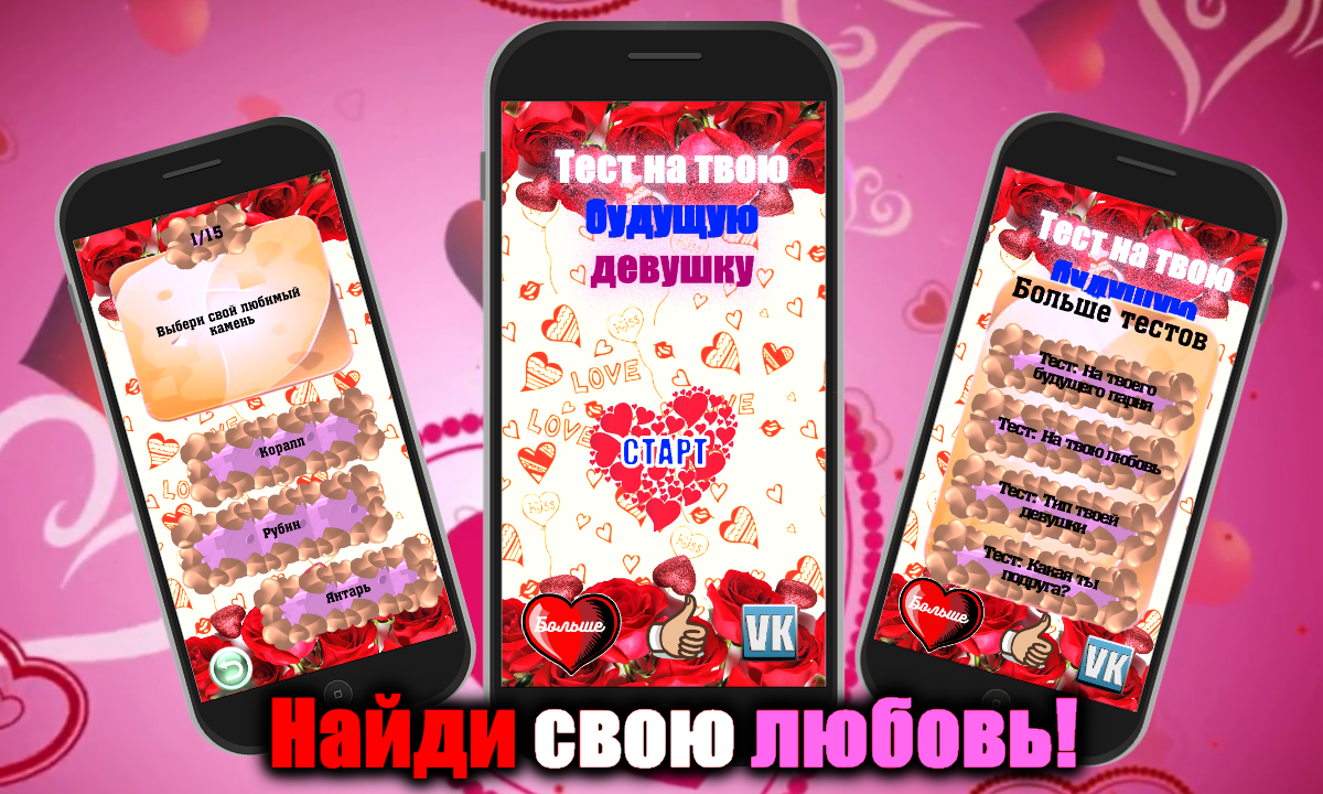 Ответьте на пару легких вопросов теста и вы узнаете имя вашей любви. Тест скачать могут и парни, и девушки! Большая база имен позволит предсказать наиболее точный результат и поможет сделать Вам правильный выбор!