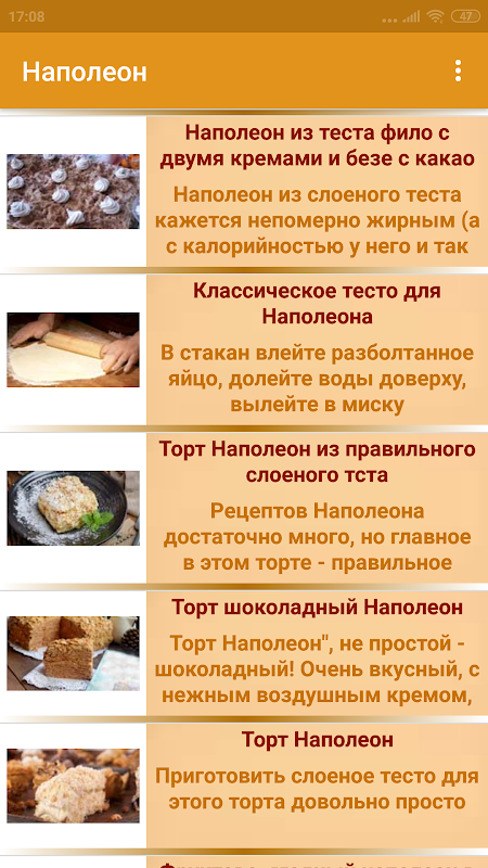 Торт Наполеон приготовленный в домашних условиях может стать украшением любого праздничного стола. Если вы стоите перед выбором, какой торт испечь на день рождения или новый год, то наше приложение вам очень пригодится. Тем более что пользоваться им можно без подключения к интернет офлайн.