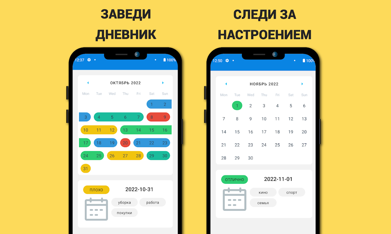 Выберите свое настроение и добавьте дела, которыми вы занимались в течение дня. Откройте нового себя с помощью трекера настроения и посмотрите как меняется ваше настроение.