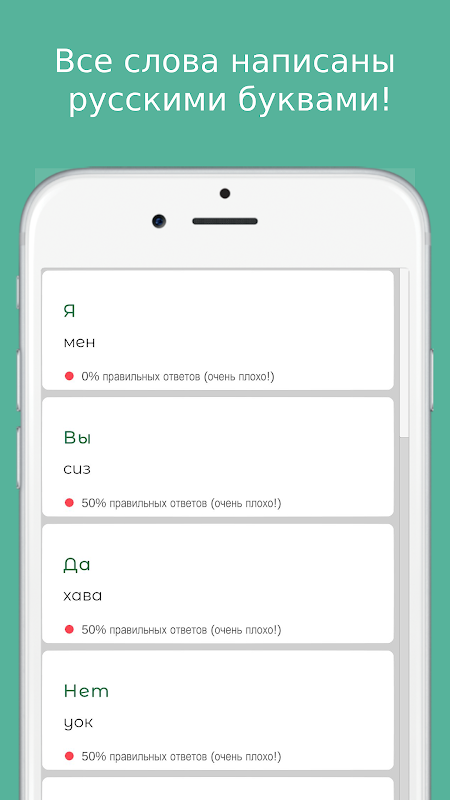 Под каждым словом есть процент и цветовой индикатор того, как хорошо вы знаете это слово.