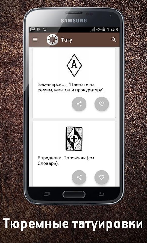 Внимание! Тюремные татуировки представленные в этом приложении взяты из непроверенных источников в интернете, поэтому не претендуют на 100% достоверность, также многие татуировки считаются устаревшими.