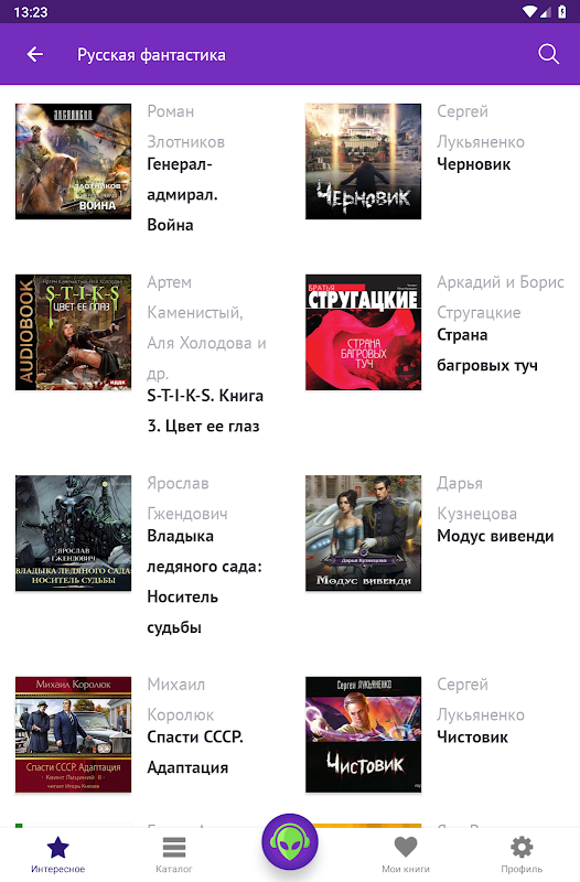 «Пикник на обочине», «Черновик», «Марсианин», «Неукротимая планета», «Капитан Немо», «Остров доктора Моро», «Дивергент», «Стальная крыса», «Игра Эндера», «Чистовик», «Метро 2034» — и это только начало бесконечного списка. Самые свежие и интересные книги каждый день появляются в библиотеке. В нашей обширной библиотеке представлены авторы: Дмитрий Глуховский, Сергей Лукьяненко, братья Стругацкие, Александр Беляев, Энди Вейер, Жюль Верн, Филип Дик, Роберт Шекли, Терри Пратчетт, Гарри Гаррисон, Герберт Уэллс — и многие другие. С нашим приложением самые популярные книги и долгожданные аудио новинки можно слушать совершенно бесплатно!